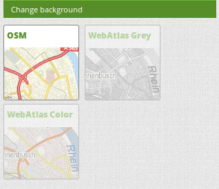The styling of the application is adapted via CSS. As a preparation you have to create screenshots of the background maps with the size 110x110px and place them in the web-folder (the screenshots have to be accessible from the outside). After that, you have to include the BaseSourceSwitcher in the sidepane, as explained in “Configuration”. The inclusion with the preview of the background map only works in the sidepane, not in the toolbar! Additionally you have to remove all groups, if you have previously used them.