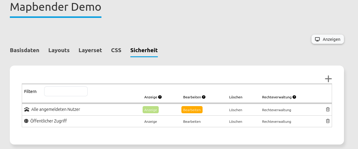 Öffentlicher Zugriff: Rechtevergabe betrifft alle unangemeldeten Besucher von Mapbender-URLs.