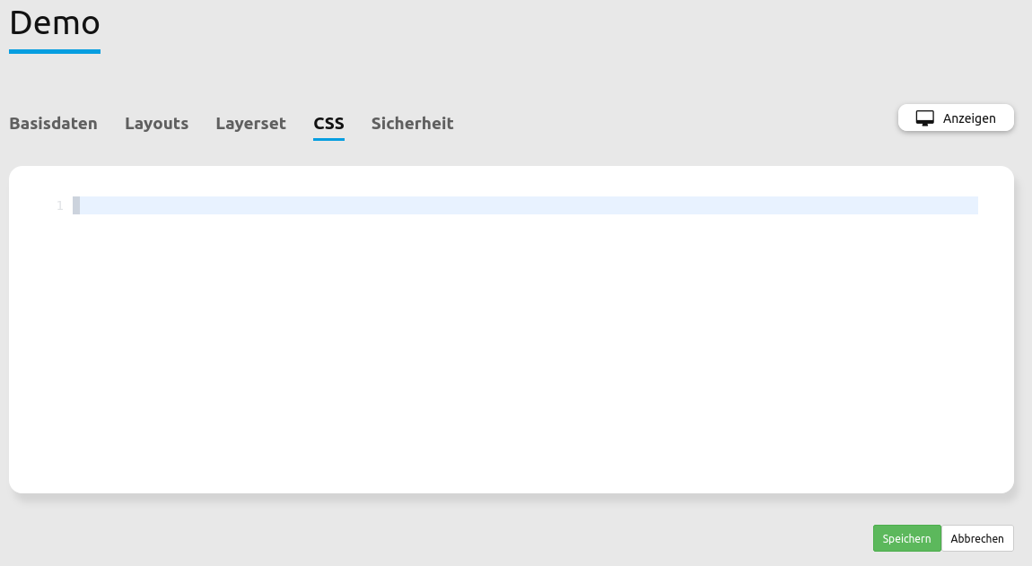 Mapbender verfügt über einen CSS-Editor zur Anpassung des Stils (Farben, Größen, Icons, …) einer Anwendung. Es ist möglich, zusätzliche CSS-Klassen zu definieren, die den Standardstil überschreiben. Sie können außerdem SCSS im Editor verwenden und auf eine SCSS-Datei in Ihrem Bundle verweisen.