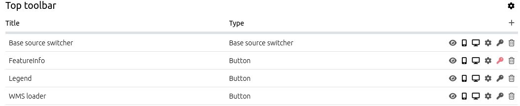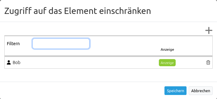 Button rechts oberhalb des Bereichs ermöglicht das Hinzufügen von Elementen. Nach dem Klick auf den Button öffnet sich eine Dialogmaske, die die Auswahl eines Elements und dessen anschließende Konfiguration ermöglicht.