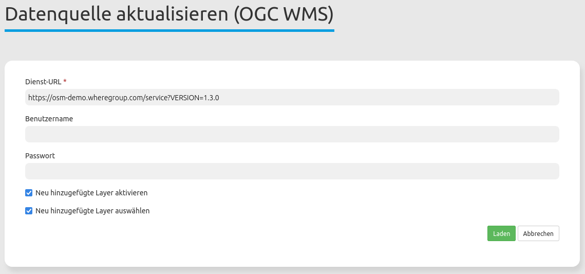 Datenquelle aktualisieren: Aktualisiert die Dienst-Informationen durch erneutes Laden des getCapabilities-Dokuments.