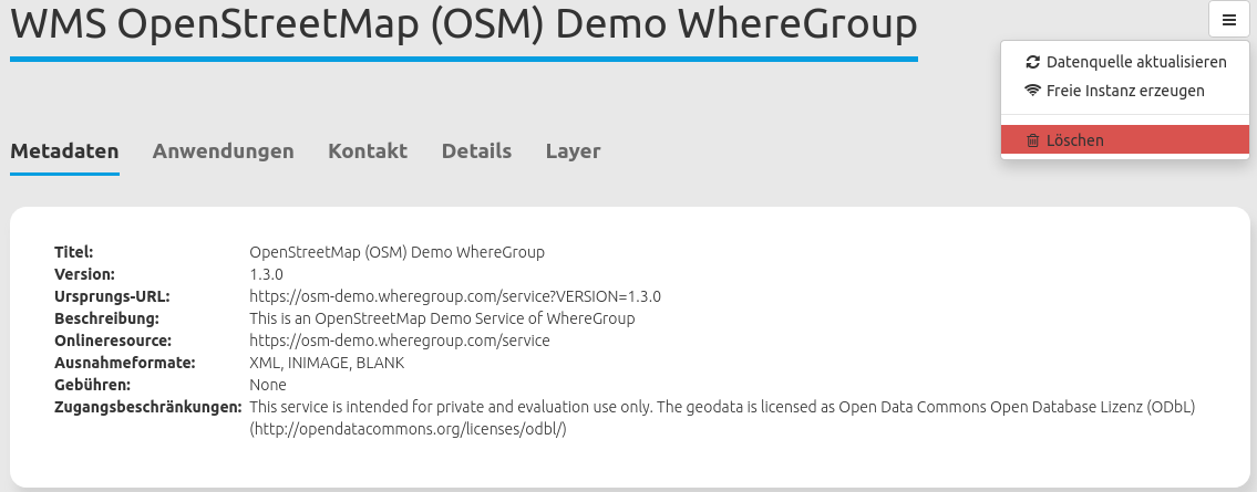 Datenquelle entfernen: Entfernt den Dienst aus Mapbender.