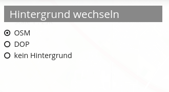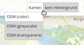 “Hintergrund wechseln” erstellt Buttons mit Themen, um zuvor für diesen Zweck konfigurierte Dienste im Kartenbereich sichtbar zu schalten. Auf diese Weise kann etwa zwischen verschiedenen Hintergrundkarten gewechselt werden. Dabei ist immer nur ein Thema aktiv. Zusätzlich können Gruppen für die Hintergrund-Themen definiert werden. Alle Definitionen einer Gruppe werden als Dropdown-Liste angezeigt, wobei der Gruppenname als übergeordneter Eintrag erscheint.