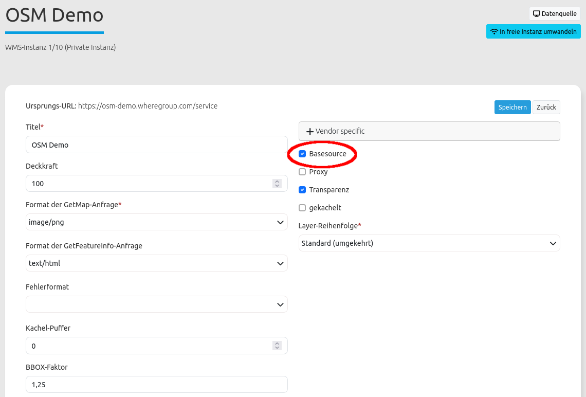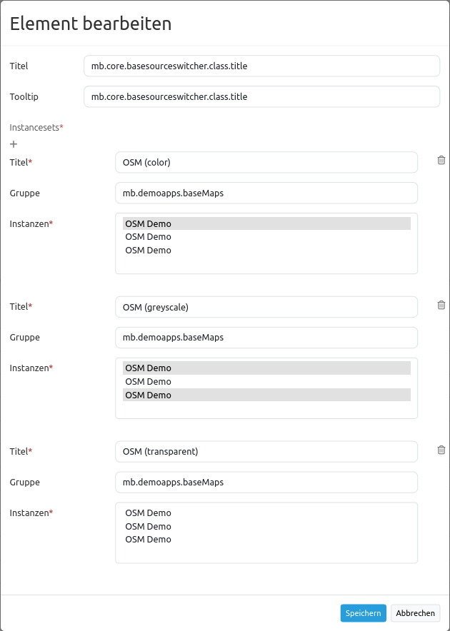 Vorbereitung: Zur Definition einer Hintergrundkarte mit dem Element müssen zuvor im Backend (Reiter: Layerset) mindestens zwei Dienste konfiguriert werden. Um sie verwenden zu können, ist in den Layerset-Einstellungen eines Dienstes das Anhaken der Checkbox “Basesource” erforderlich.