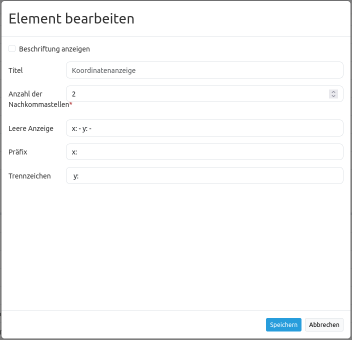 Titel: Titel des Elements. Dieser wird links neben den Koordinaten angezeigt, wenn “Beschriftung anzeigen” aktiviert ist.