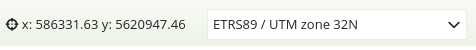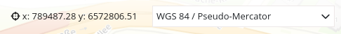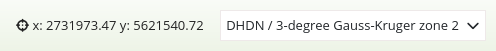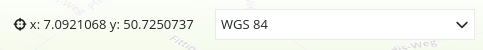 Die Koordinatenanzeige zeigt die Mausposition in den Kartenkoordinaten an. Die Koordinaten sind abhängig vom eingestellten räumlichen Referenzsystem, welches im SRS Auswahl (SRS Selector) geändert werden kann.