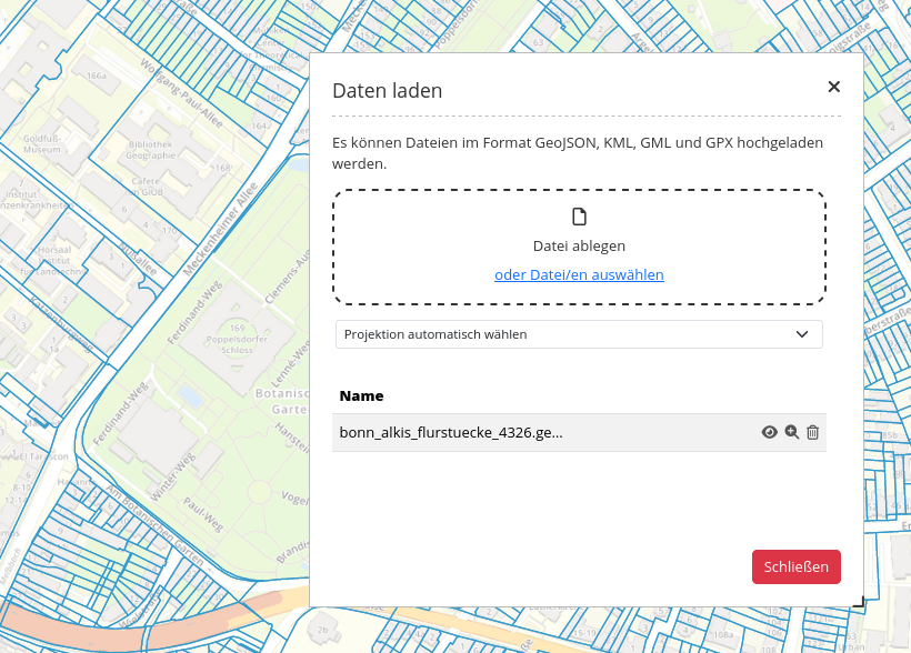 Mit Daten laden können Punkte, Linien, Polygone und Multipolygone aus Geodaten in den Formaten GeoJSON-, KML-, GML- und GPX geladen werden. Sie können eine oder mehrere Dateien per Drag-and-Drop oder über die Dateiauswahl hochladen. Für eine passende Projektion wählen Sie entweder ein eigenes Koordinatenreferenzsystem oder nutzen das Feature Projektion automatisch bestimmen.