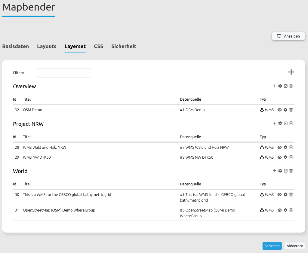 Für die Einrichtung der Layersets wurden die vier oben genannten Dienste als Instanzen hinzugefügt (detaillierte Information siehe oben oder in der Doku der Layerset und Datenquellen (Sources)).