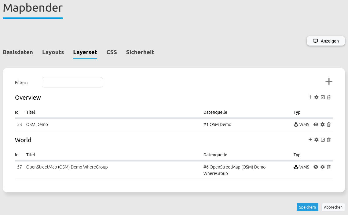 Über den Reiter Layerset können Layersets definiert und Datenquellen in eine Anwendung eingebunden werden.