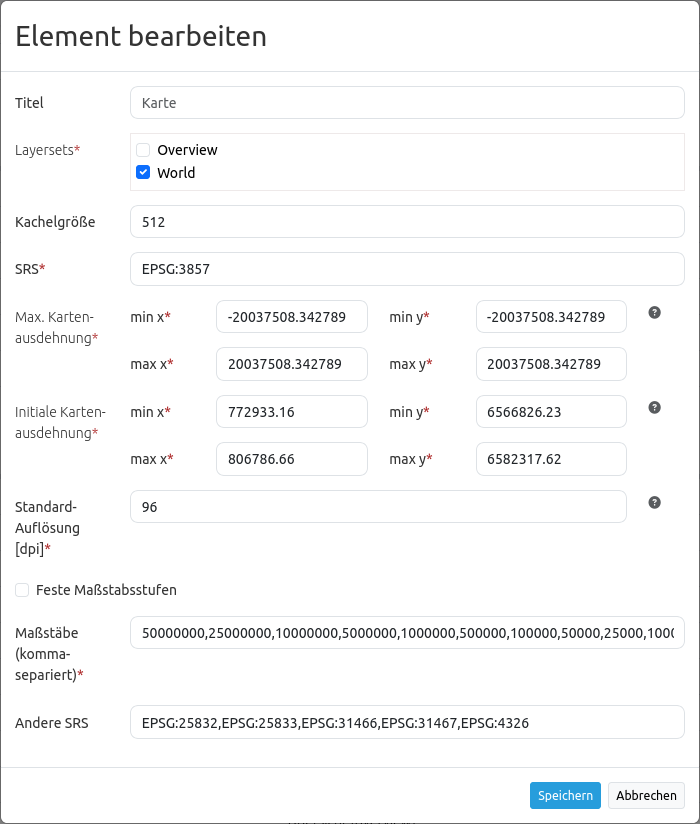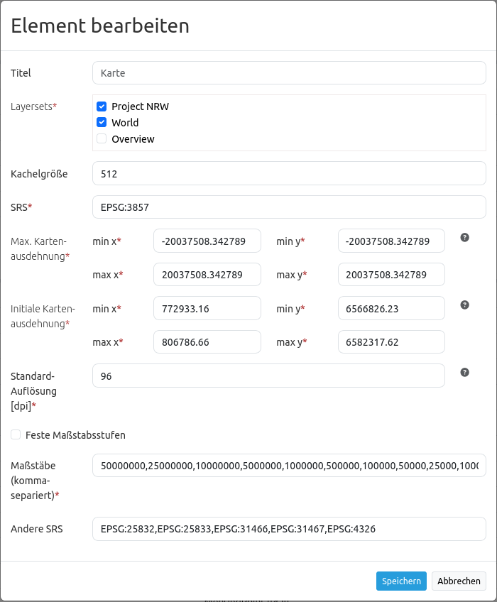 Einrichtung der Layersets im Kartenelement.