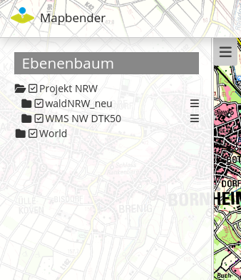 Das Layerset “World” wird als Thema angezeigt, ist jedoch nicht geöffnet. Beim Layerset “Project NRW” wird das Thema beim Öffnen der Anwendung aufgeklappt gezeigt. Zusätzlich können alle Layer können über einen Button aktiviert werden.
