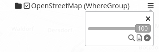 Die einzelnen Funktionen können durch Klicken auf die Schaltfläche aktiviert werden. Alle aktiven Funktionen werden farbig hinterlegt. In der Anwendung erscheint im Ebenenbaum rechts neben jedem Layer ein Kontextmenü. Durch einen Klick auf das Menü klappt ein Fenster auf und die zuvor aktivierten Funktionen können genutzt werden. Durch einen Klick auf den x-Button oben rechts kann das Menü wieder geschlossen werden.