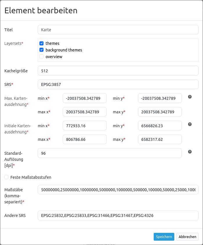Andere SRS: Weitere auswählbare Projektionen unter denen die Karte angezeigt werden kann (werden durch Komma getrennt). Zwei Arten der SRS Definition werden unterstützt: EPSG:CODE oder EPSG:CODE|MEIN SRS TITEL.