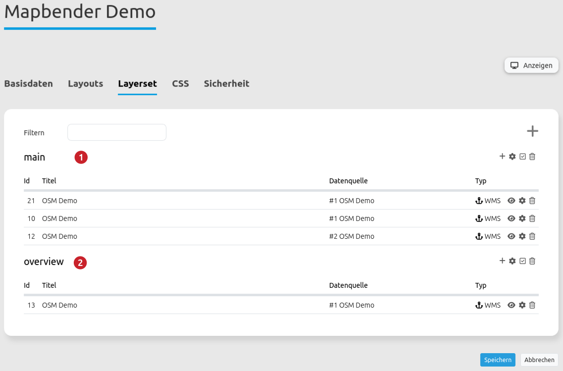 In der Karte können alle Instanzen angezeigt werden, welche im Layerset enthalten sind. Im vorliegenden Beispiel wird zwischen der Hauptkarte/main (1) und Übersichtskarte/overview (2) unterschieden.