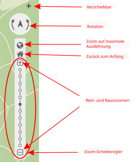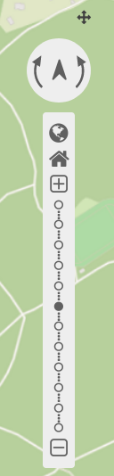 Das Element erleichtert die Navigation in der Karte (Rotation und Zoom) durch entsprechende Buttons. Der Kartenmaßstab kann dabei individuell über eine Leiste angesprungen oder über die Zoom in/out-Buttons abgeändert werden. Es besteht zudem die Möglichkeit, auf die maximale Kartenausdehnung zu zoomen oder zum Anfangszustand zurück zu navigieren. Das Navigationselement kann verschoben werden, wenn die Option aktiviert wird.