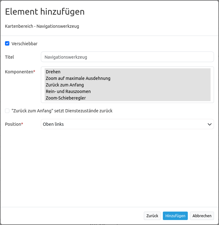 Rein- und Rauszoomen: Ermöglicht das Hineinzoomen, sowie das Hinauszoomen aus der Karte. Der Kartenausschnitt springt dabei immer zum jeweils nächstgrößeren bzw. -kleineren Maßstab. Je nach Definition im Kartenelement sind größere oder kleinere Zoomschritte möglich. Nutzer haben außerdem die Möglichkeit, feste Zoomstufen im Kartenelement zu deaktivieren.