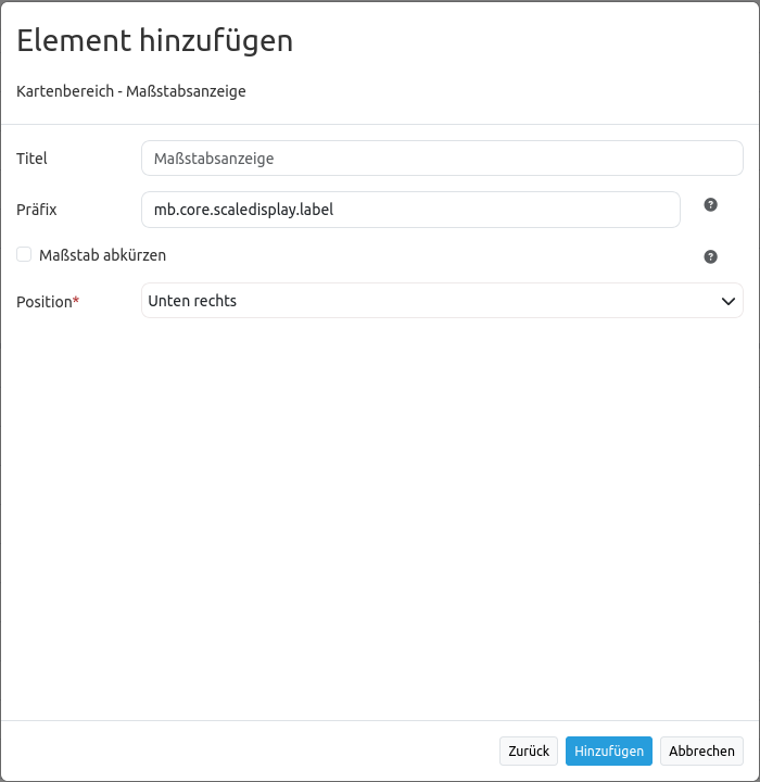 mb.core.scaledisplay.labelwird als Maßstab in der Sprache des Benutzers gerendert.Maßstab abkürzen: Falls aktiviert, werden Maßstabszahlen ab 10.000 nicht ausgeschrieben, sondern mit nachgestelltem