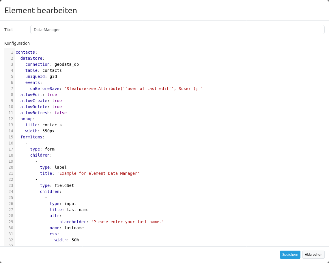Die Definition des Data Managers erfolgt in YAML-Syntax. Hier definieren Sie die Datenbankverbindung, die editierbaren Felder und den Formularaufbau.