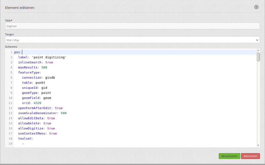 Die Definition des Digitizers wird in einer YAML-Syntax durchgeführt. Hier definieren Sie die Datenbankverbindung, die editierbaren Felder, das Formular für die Anzeige und andere Verhaltensweisen.