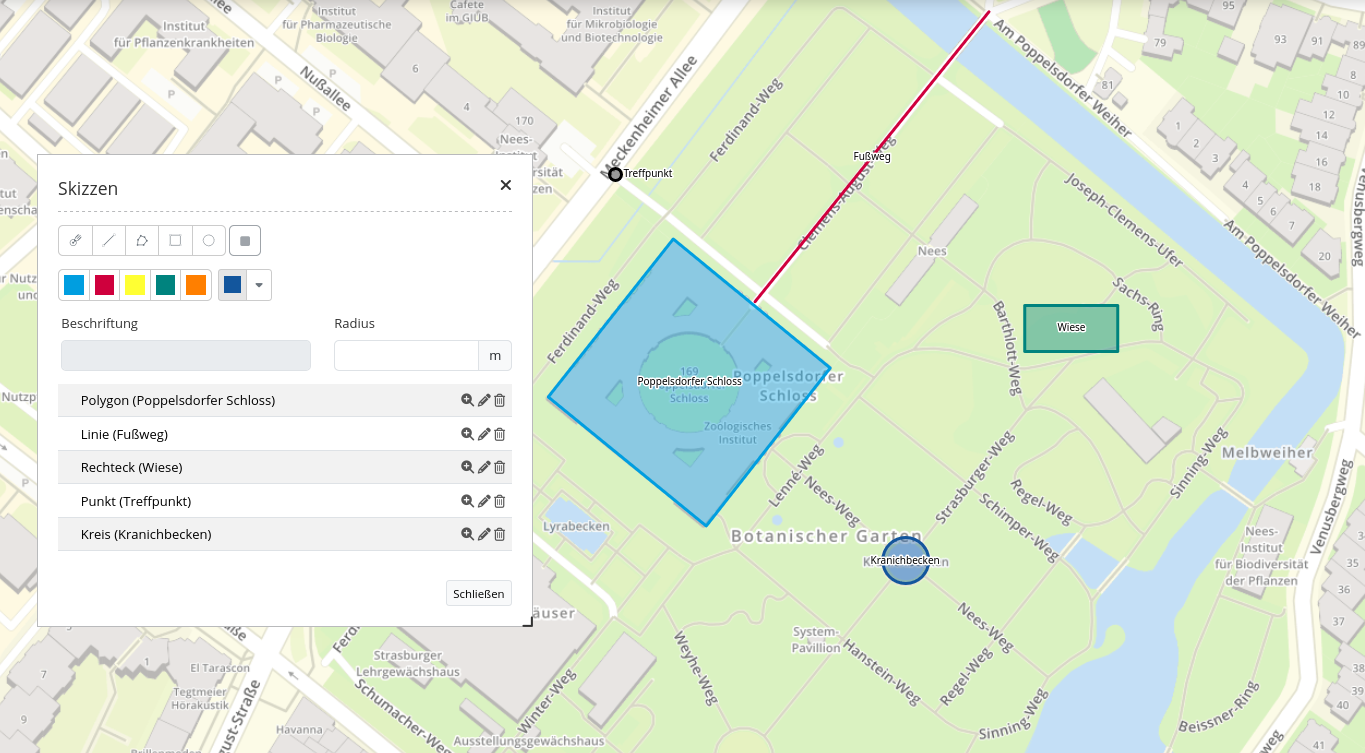 Nach der Konfiguration im Backend finden sich Farben als Button im Skizzen-Werkzeug. Um einer Skizze eine bestimmte Farbe zuzuweisen, muss zunächst das gewünschte Geometriewerkzeug und anschließend der gewünschte Farbbutton angeklickt werden. Auch bereits gespeicherte Geometrien lassen sich farblich anpassen: Dazu muss eine Skizze per Klick auf “Editieren der Geometrie” (Bearbeiten-Button) ausgewählt und anschließend die gewünschte Farbe per Mausklick zugewiesen werden. Ein Farbwechsel per Klick auf den entsprechenden Farb-Button ist auch während des Erstellens einer Geometrie möglich. Der Farbwähler, der im Backend mit Farbanpassung erlauben aktiviert werden kann, erlaubt eine freie Farbwahl auf Anwendungsebene. Sofern das Auswählen von Farben komplett deaktiviert und stattdessen nur eine einzige Farbe angeboten werden soll, muss die gewünschte Farbe im Konfigurationsdialog definiert und die Checkbox Farbanpassung erlauben deaktiviert werden.