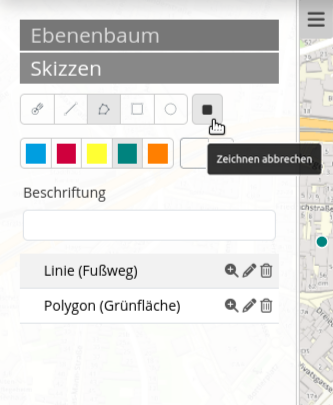 • Beim Schließen deaktivieren: Erstellte Skizzen werden nach Schließen des Elements (Button oder Sidepane) nicht mehr in der Karte angezeigt. Erneutes Öffnen zeigt erstellte Skizzen wieder an.