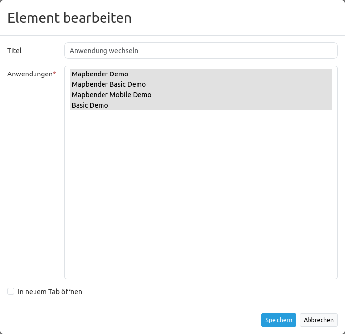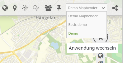Dieses Element stellt ein Auswahlbox bereit, über die zwischen Anwendungen gewechselt werden kann. Dabei bleibt der aktuelle Kartenausschnitt erhalten.