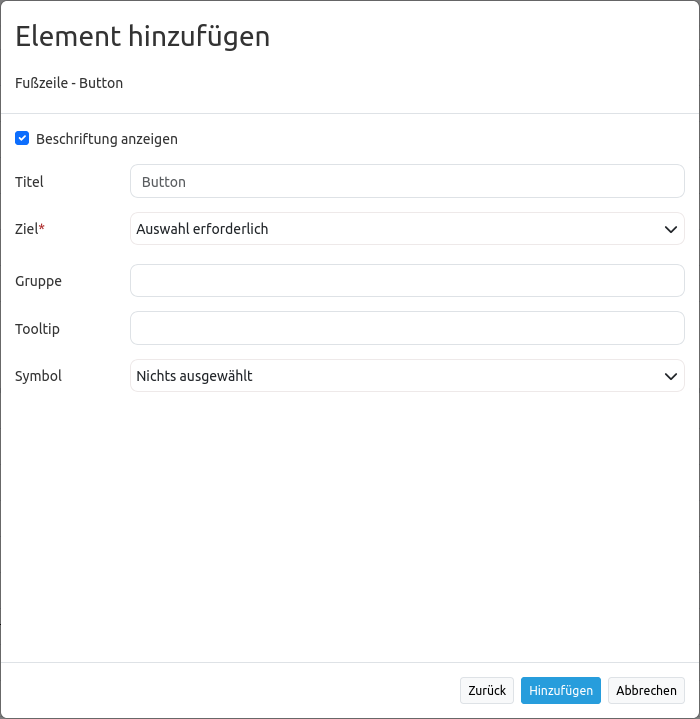 Titel: Titel des Elements. Dieser wird in der Layouts Liste angezeigt und ermöglicht, mehrere Button-Elemente voneinander zu unterscheiden. Der Titel wird außerdem neben dem Button angezeigt, wenn “Beschriftung anzeigen” aktiviert ist.