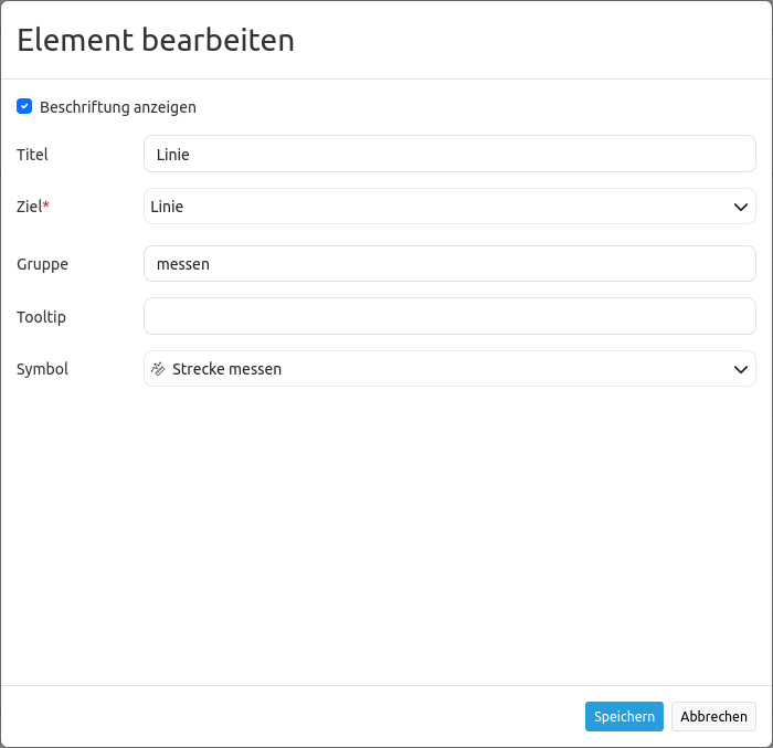 Im Anwendungsbeispiel ist der Titel des Buttons “Linie”. Als Target wird das vorher im Kartenbereich erstellte Element “Linie” eingebunden. Um die Gruppierung mit der Flächenmessung möglich zu machen, wird im Feld Gruppe ein Gruppenname vergeben. Hier lautet die Bezeichnung der Gruppe “messen”. Dieser Gruppenname wird analog auch bei dem Button für die Flächenmessung eingetragen. Als Symbol wird “Strecke messen” gewählt.