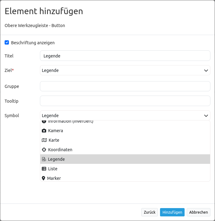 Nach Auswahl des Elements Button öffnet sich der Dialog “Element hinzufügen – Button”. Hier werden die Einstellungen zur Konfiguration des Buttons vorgenommen. Die Bezeichnung des Buttons zum Öffnen der Legende wird im Feld Titel eingetragen und lautet hier “Legende”. Im Beispiel wurde kein Text für “Tooltip” definiert. Das heißt, es erscheint kein Text, wenn die Maus über den Button innehält. Als Icon können nun eine Vielzahl an Möglichkeiten ausgewählt werden. In diesem Fall wird die Option “Legend” gewählt.