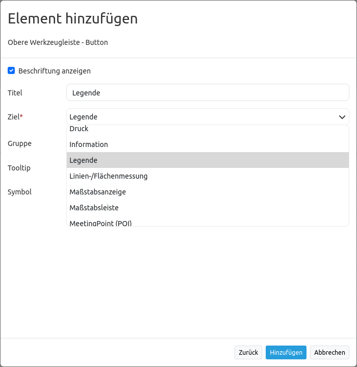 Nun wird im Feld Ziel gewählt, welche vorher definierte Funktion mit dem Button angesprochen werden soll. Die Liste, die dort als Dropdown-Menü erscheint, beinhaltet alle Funktionen, die vorher im Kartenbereich, in der Sidepane oder Fußzeile konfiguriert wurden. Da hier der Button für die Legende konfiguriert wird, muss ebenfalls die Option “Legend” gewählt werden.