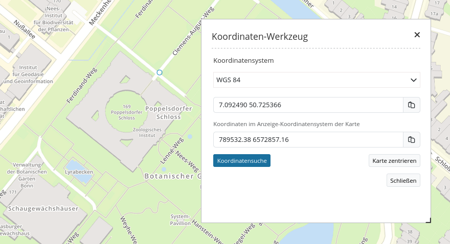Die Schaltfläche hinter jeder Eingabezeile erlauben es, den Koordinatenwert direkt in die Zwischenablage zu kopieren.