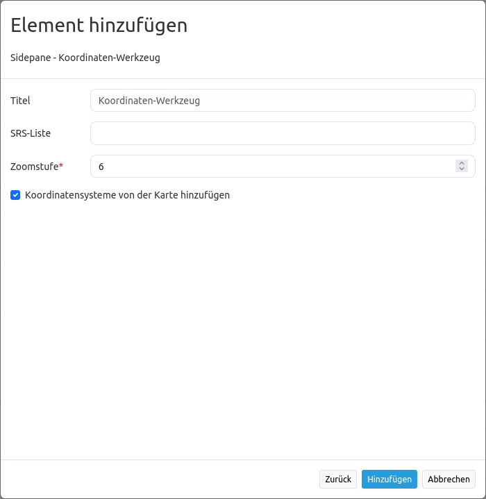 Koordinatensysteme von der Karte hinzufügen: Ist die Checkbox aktiviert, so werden die von der Karte (Map) angegebenen Koordinatensysteme automatisch vom Tool unterstützt. Diese werden in der Karte angegeben und auch im SRS Auswahl (SRS Selector) unterstützt.