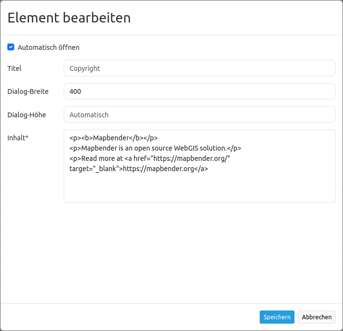 Inhalt: Inhalt des Copyright Fensters. Dieser wird angezeigt, wenn das Element per Klick aktiviert wird (oder beim Start der Anwendung, wenn die “Automatisches Öffnen”-Option aktiviert wurde).