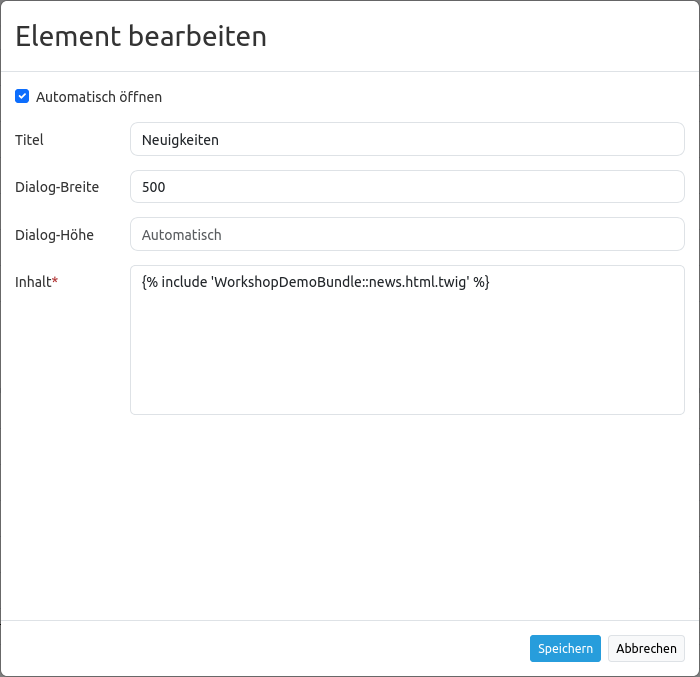 Im Content-Bereich kann auch auf eine Twig-Datei verwiesen werden. Bitte beachten Sie, dass die Twig-Datei valides HTML enthalten muss.