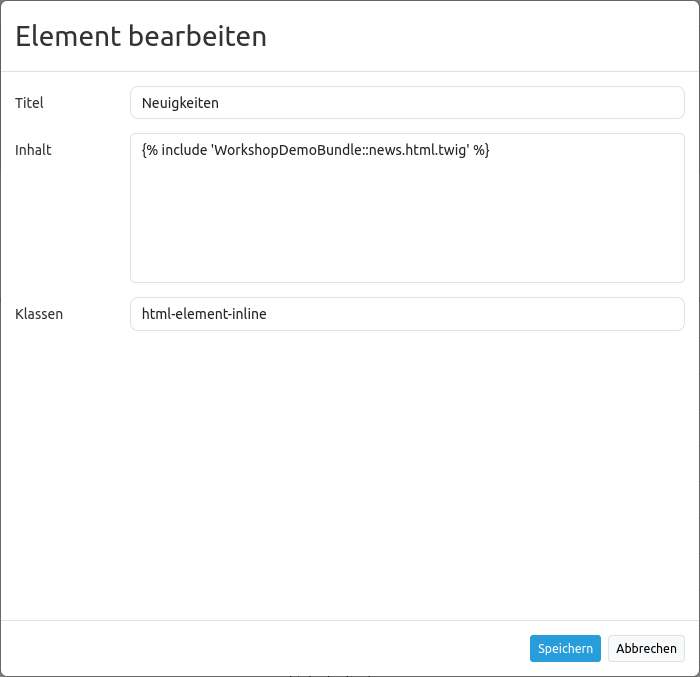 Im Bereich Inhalt kann auch auf eine Twig-Datei verwiesen werden. Bitte beachten Sie, dass die Twig-Datei valides HTML enthalten muss.