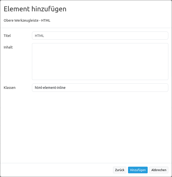 Titel: Titel des HTML-Elements. Dieser wird in der Layouts-Liste angezeigt und ermöglicht, mehrere HTML-Elemente voneinander zu unterscheiden.