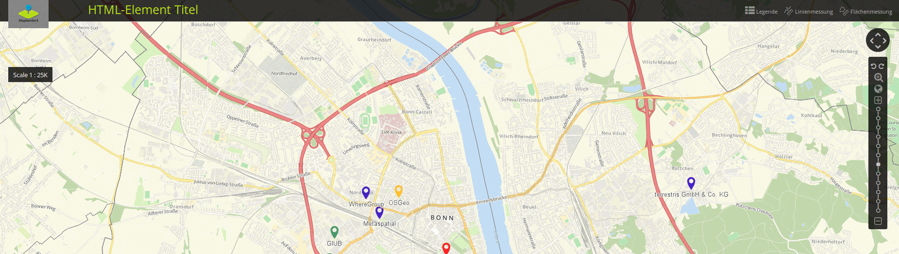 Dieses Element ermöglicht die Definition von HTML an beliebigen Stellen in der Anwendung. Dadurch können zum Beispiel Bilder, Links oder Texte eingebunden werden. Die folgende Abbildung zeigt die Integrierung des Mapbender-Logos in Fußzeile, oberer Werkzeugleiste und Sidepane.