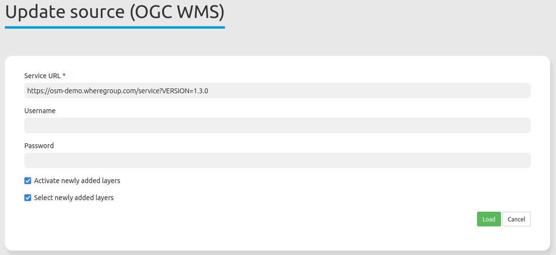 If you want to save the changes, click the Load button to refresh the WMS. This will re-read the getCapabilities document. The updated version will be displayed in the configuration settings, with changes applied in applications using the service.