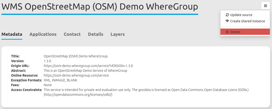 Delete source: Removes the registered service from Mapbender.