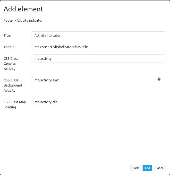The activity indicator element provides a simple widget showing background activity (Ajax calls and pending map tile requests). In the default configuration it uses a Font symbol.