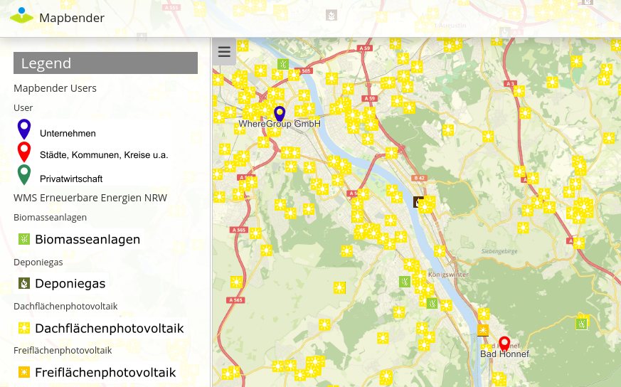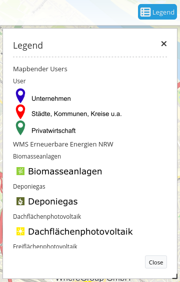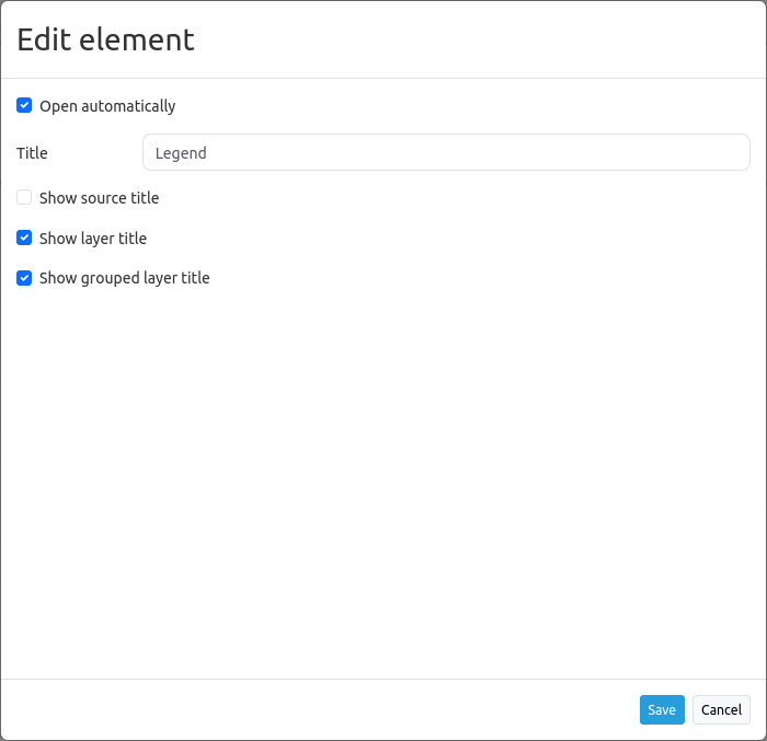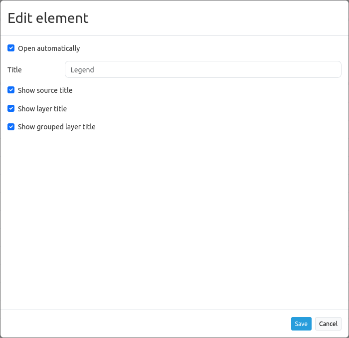 Our configured element has the title “Legend”. The legend opens automatically (set checkbox Open automatically). Moreover, the layer title and the title of all grouped layers will appear if the checkboxes Show layer title and Show grouped layer title are set.