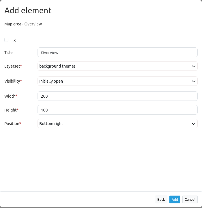 The element provides various configuration options. In the example, the settings Visibility Initially open and Fix are activated. As a result, the element is displayed (i.e. maximized) when the application is opened and the view of the map is fixed. If the latter function is deactivated, the overview adapts as soon as the map is moved or the scale is changed. The start extent is displayed when the application is opened. In the example, the element has the title “Overview”. It is necessary that the overview map is linked to a layerset. The following layersets are available: