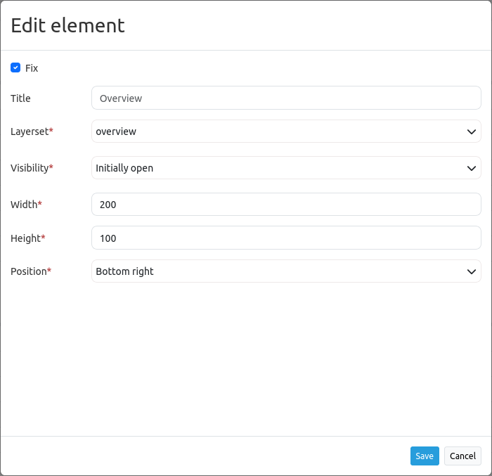 In this first example, the layerset “Overview” was chosen. Width and height of the element correspond to the default setting. The position is defined as “lower right”. The element looks like this in the application: