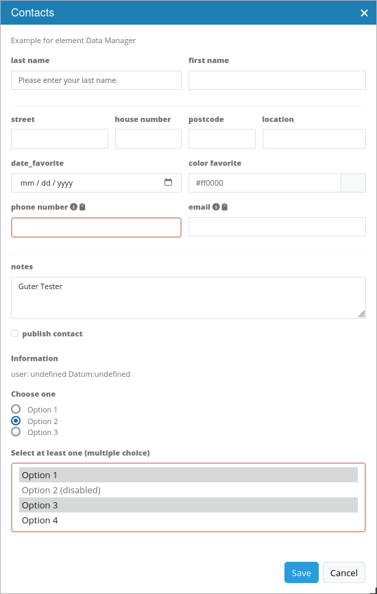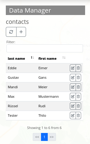 The element Data Manager is similar to the Digitizer. However, Data Manager only works with nonspatial data, i. e. you can not create geometries. Data Manager can be used to maintain reference tables, for example a table with contact information.