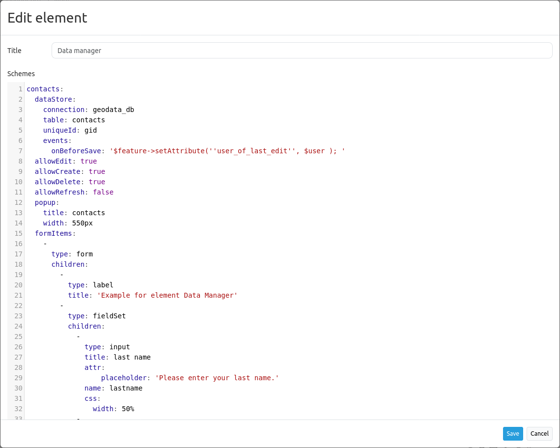 The definition of the Data Manager is done in YAML syntax in the textarea configuration at schemes. Here you define the database connection, the editable tables, the attribute form.