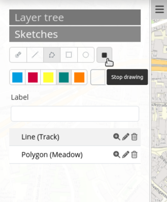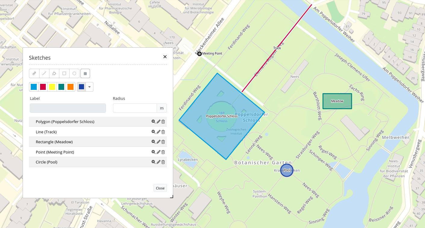 The Sketches element allows creating, editing and deleting temporary objects. Sketches are not saved within a database and will be lost after the browser window is refreshed or closed. Sketch geometries will be exported into Image Export and PrintClient.