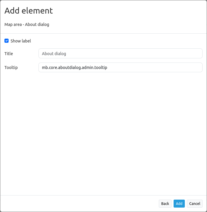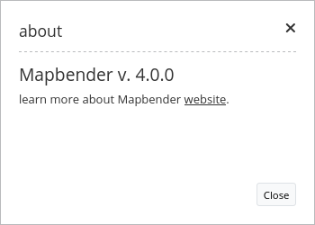 This element creates a Button which shows a simple about dialog, listing the version of your Mapbender installation. The button can be placed into the toolbar and the footer region.