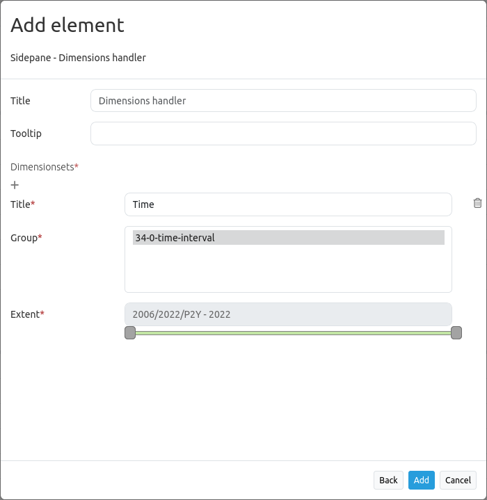 Defining a dimensionsset: Next, define a dimensionsset. You can create a new set in the element via the “+” button. Type in a title for the set and select a Group.