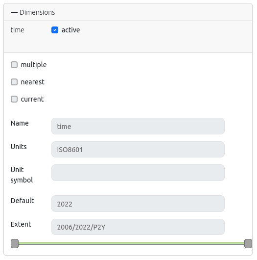 If a service supports a time dimension, the instance displays the Dimensions button. By clicking on this button, the supported time parameters are displayed and time values can be activated by clicking the checkbox. Another click on the form shows more customization options. Here you can optionally further restrict the values from the WMS service as follos to set up the service: