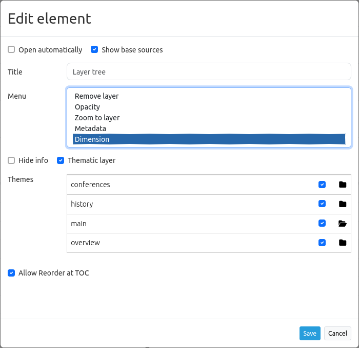 When an instance is selected, all instances that do not conform to this default are no longer selectable. Finally, save the configuration to add the Dimensions handler element to the Mapbender application.